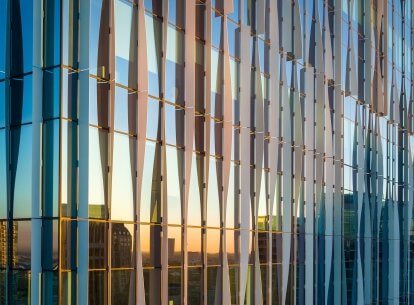 The glass and aluminum curtain wall system marked by signature curvilinear fins mimics fabric draped over the façade. In its original conception, each of the 2,400 individual fin units had a unique, non-repeating profile. To make the design vision constructible within the limits of time and budget, we simplified and systematized the fins in consultation with the curtainwall fabricator to provide three unique profiles and three unique attachments which could be combined and trimmed to create more complex geometries. Our design drawings focused on providing clarity to support seamless coordination and execution by the contractors. These discrete fin profiles, when appropriately configured, disguise the underlying simplicity to create the dynamic, flowing expression that graces the skyline today.