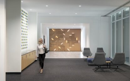 More plays on Baylor Scott & White Health's signature 45 degree mark are seen throughout in colorful suspended art installations.