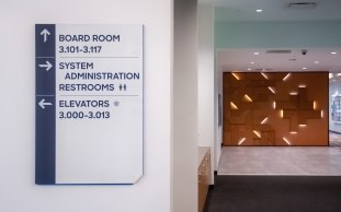 The interior signage solution supports the branded environment offering subtle branded details including their signature 45 degree mark, branded color palette, and customized icons. The exterior signage scope includes site monuments and directional, garage wayfinding, building identity, and a signature totem providing a gateway into the campus.