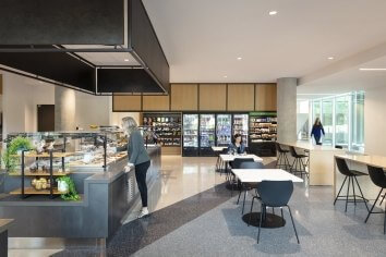 The headquarters includes fitness, kitchen, dining, training, auditorium, board room, open and private office space, hoteling, and collaboration and meeting rooms.