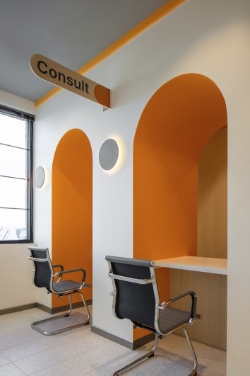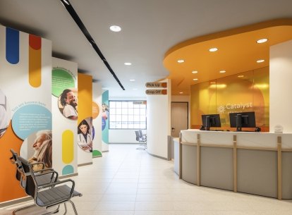 To supplement the signage and wayfinding and convey their mission, Corgan’s branded environments team guided Catalyst Health Rx through an intensive branding process. Key to their mission is their dedication to their patients, and woven throughout the pharmacy through color, graphic design, and testimonials are their stories. By highlighting this commitment to their patients, new and existing customers can feel reassured that their health and experience is in good hands.