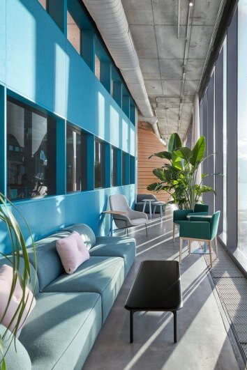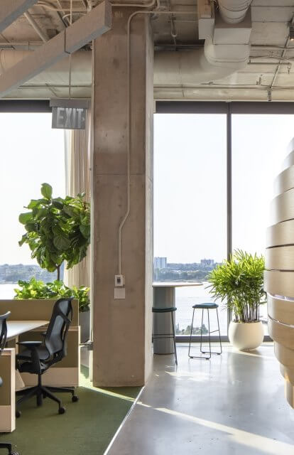 Lounge seating with soft materials in tans, greens, and blues set amid lush natural elements inviting team members to relax, reflect, and regroup, while layered meeting rooms and back-to-back desks offer collaborative zones to engage larger teams for sustained work.