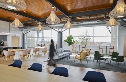 In Phase Two, Corgan provided interior design services, branding and furniture selection, building upon the strategy from the first phase. With the goal of right-sizing the renovated space to accommodate hybrid work, the team evaluated the existing furniture.
