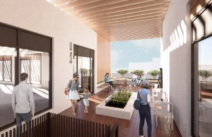 The interior breezeway, finished with colorful floor and wall tiles, artistic wall murals, and biophilic elements, creates an engaging and lively indoor/outdoor space reflective of Florida’s nearby beach towns. The design attracts tenants and welcomes visitors and employees to enjoy the space and outdoor amenities for years to come.